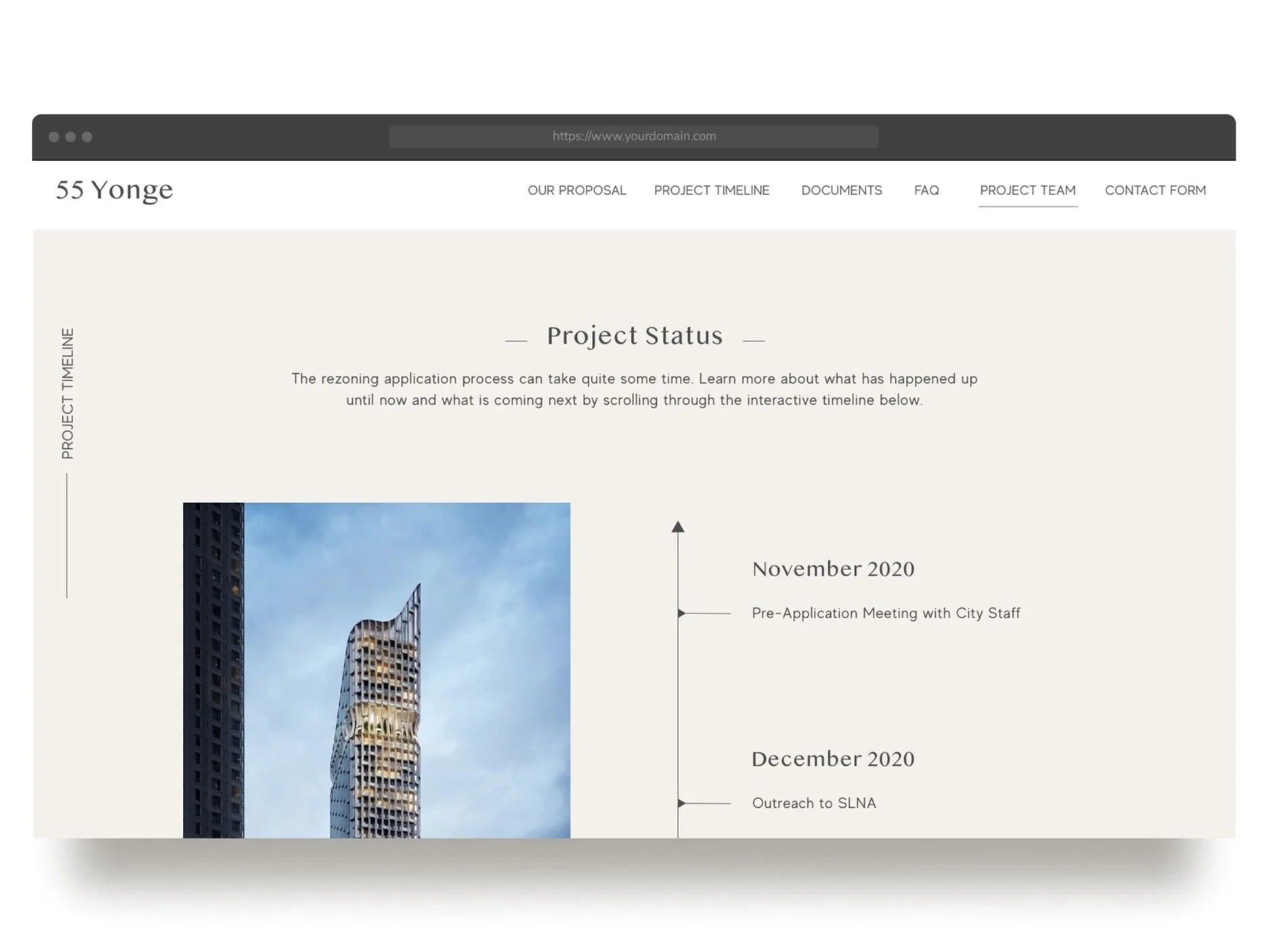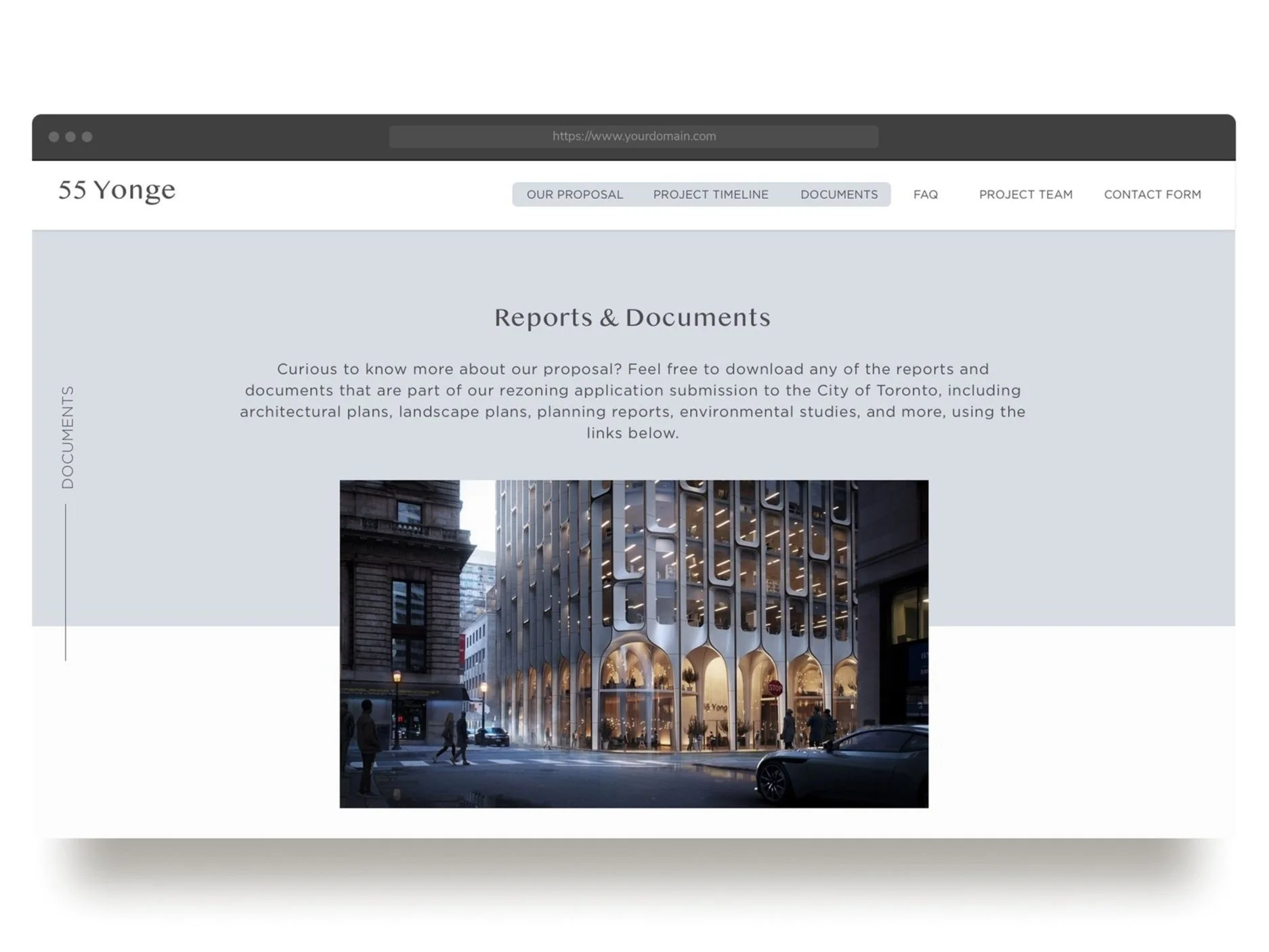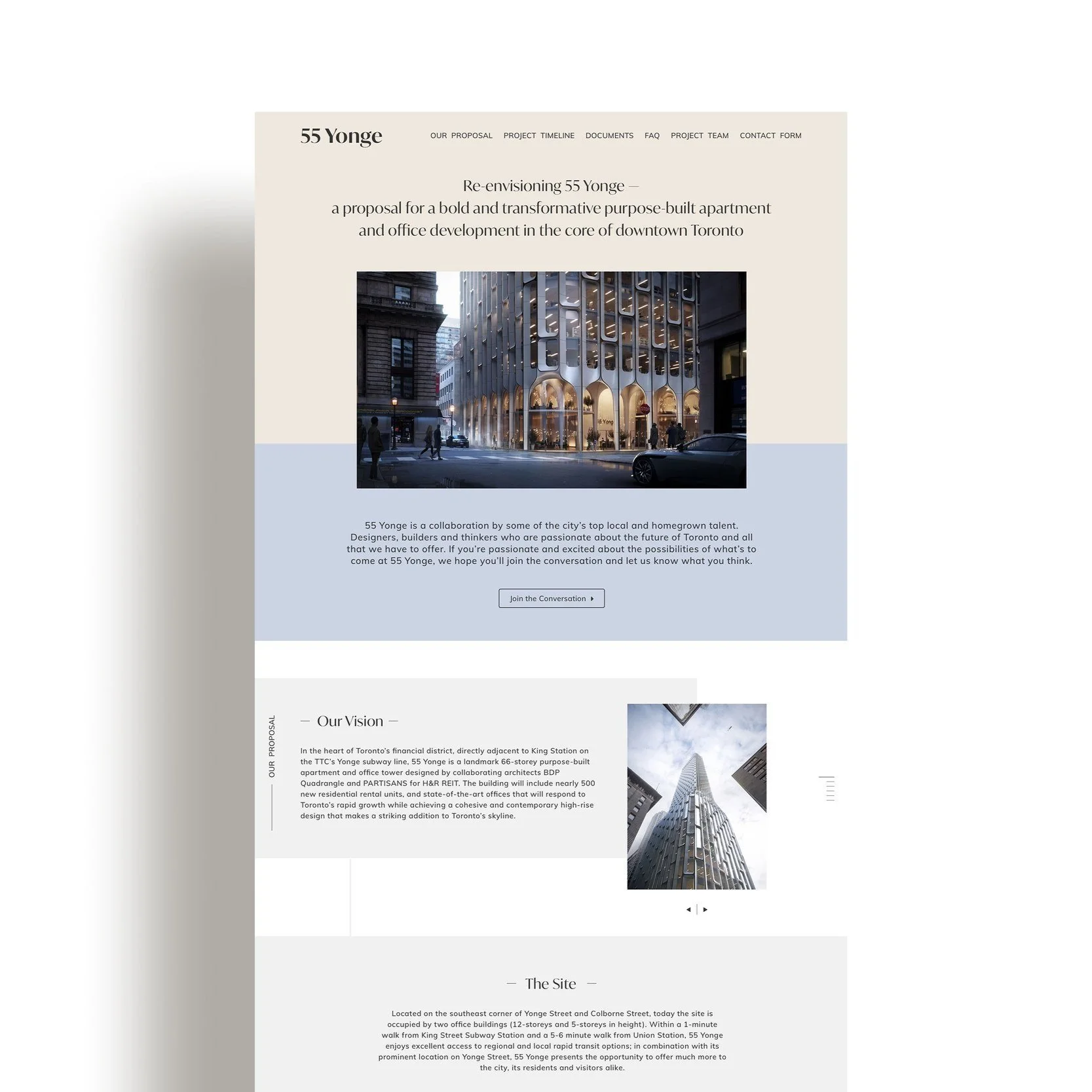 55 Yonge is a rental apartment that is set to be built in Downtown Toronto. The purpose of this project was to create a website that would highlight the development plans, the vision of the building, give an idea of what the design will be like, and answer any FAQ questions. The client wanted everything to be condensed to one transparent website with the intention of presenting the project to the City of Toronto.